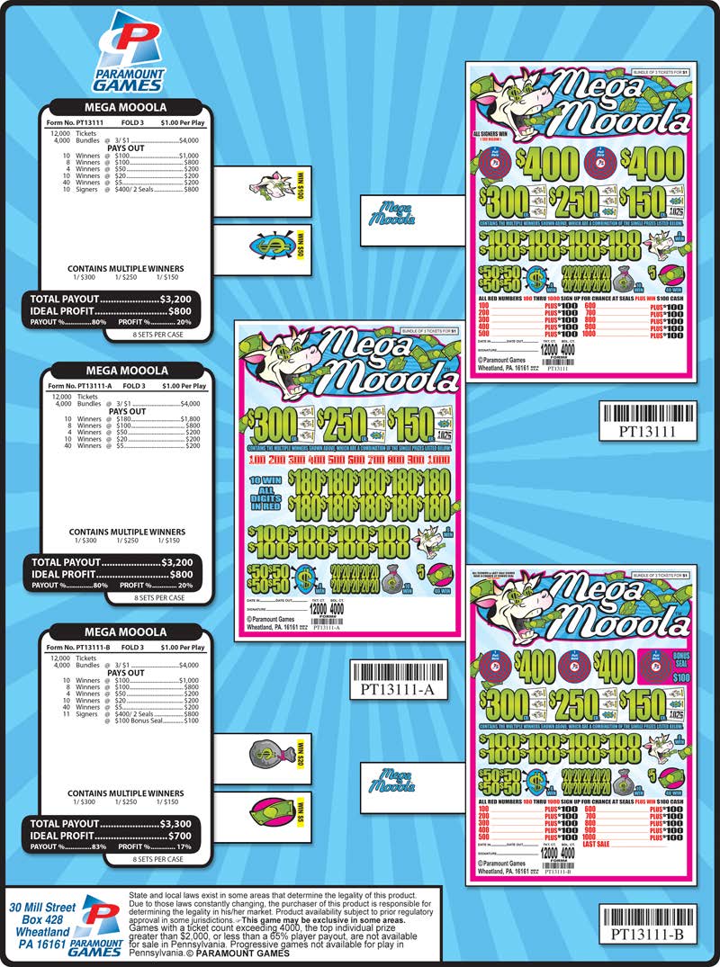 $1 per bundle – 4,000 bundles (12,000 tickets) – Top prizes of $300, $250, $150, and 10 $180 prizes – $5 Bottom prize
