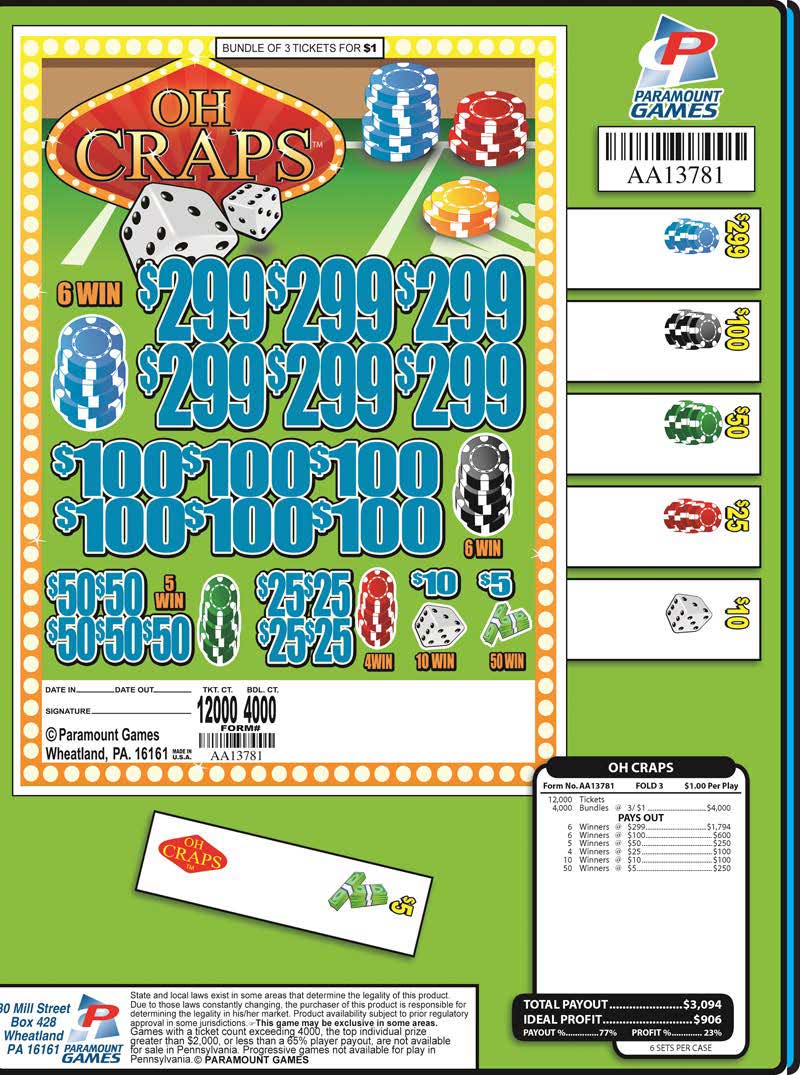 $1 tickets, total ticket count is 12,000. Top prize of $299 and bottom prize of $5.