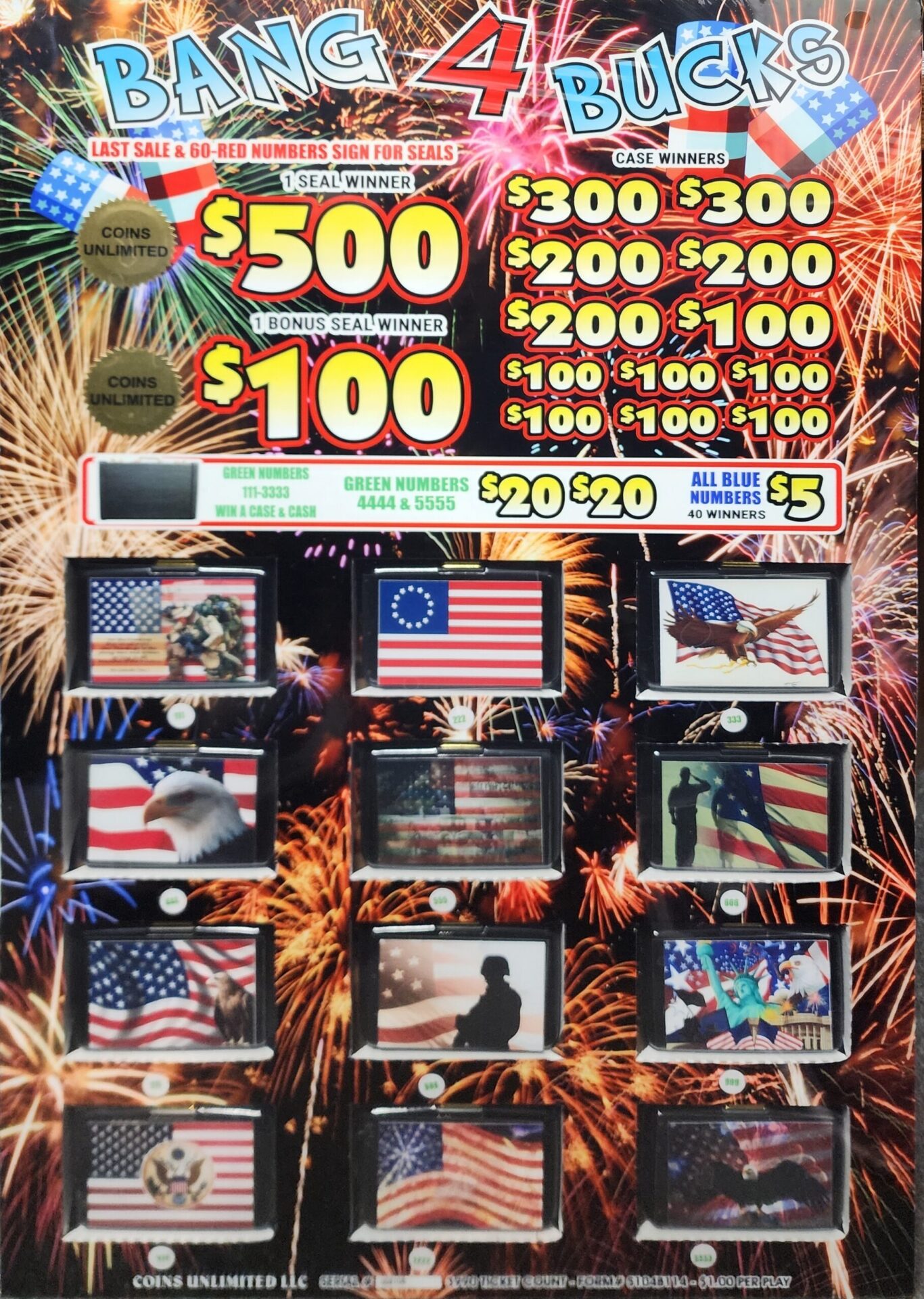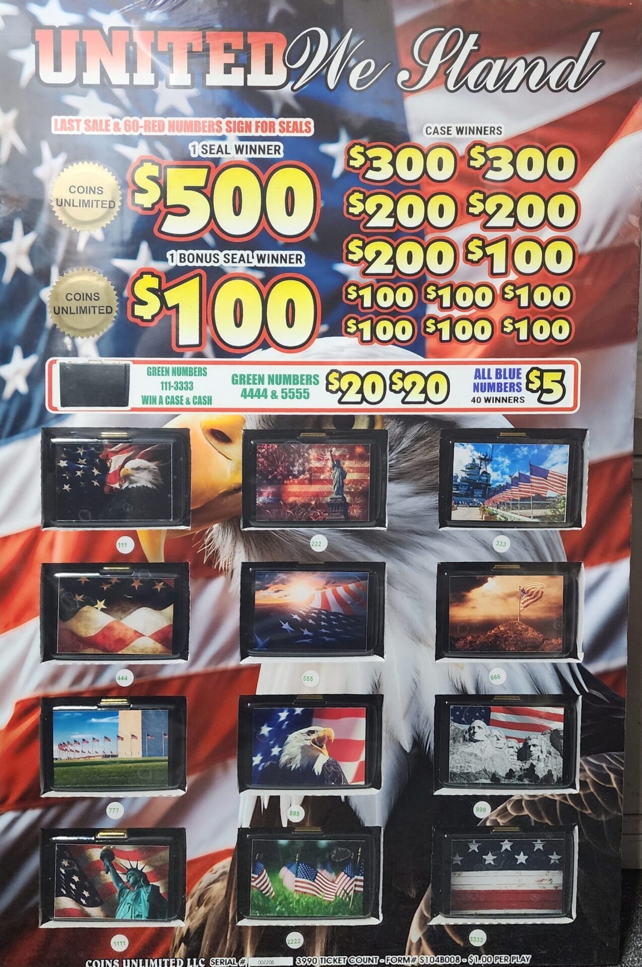 $1 tickets (3990 tickets) – 1 $500 Seal Winner, 1 $100 Seal Winner, $300, $200, and $100 Case Winners, and instant prizes of $20 or $5