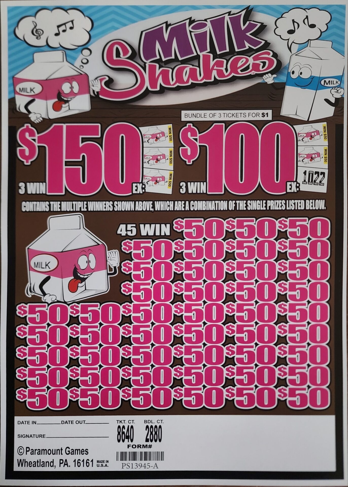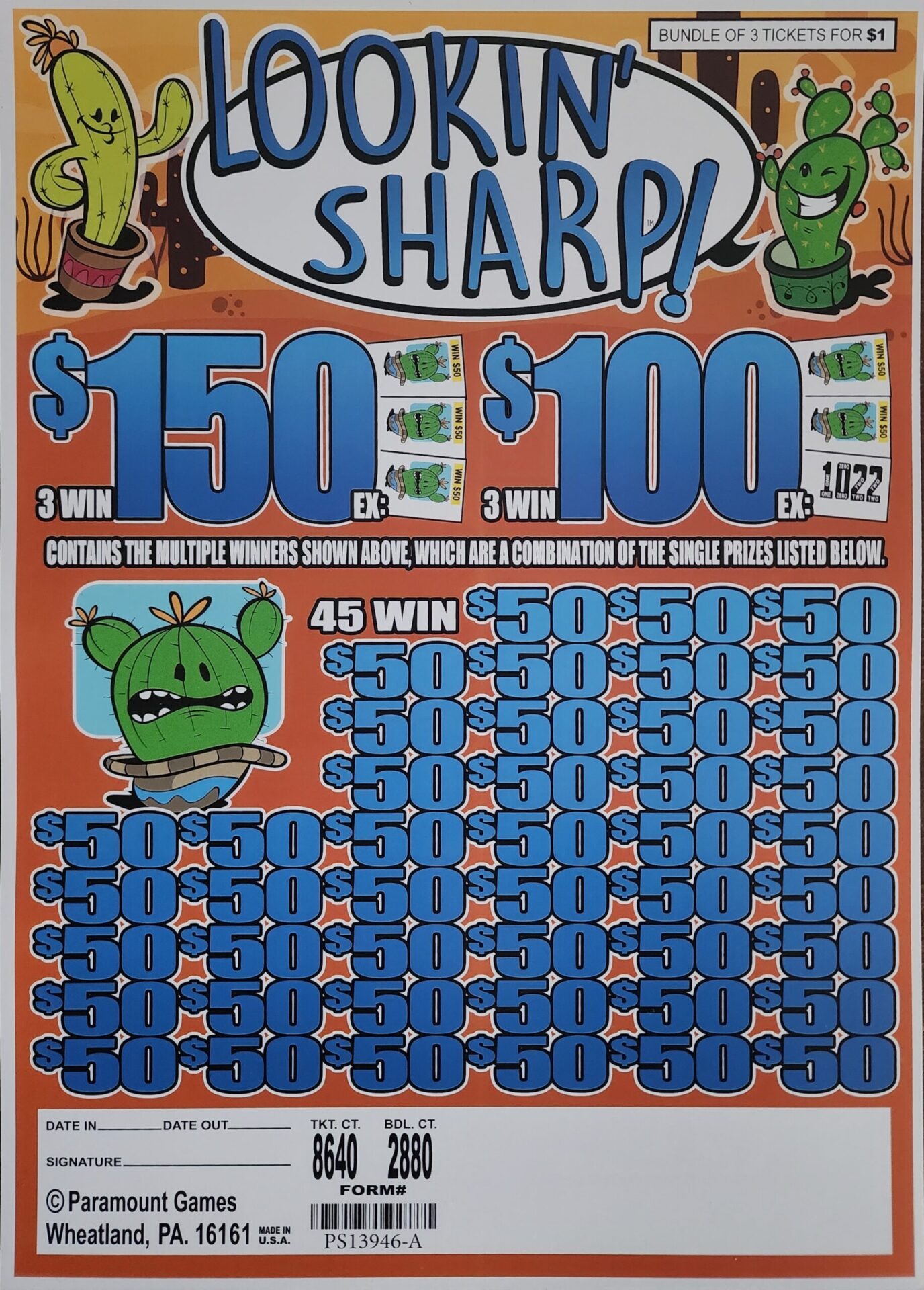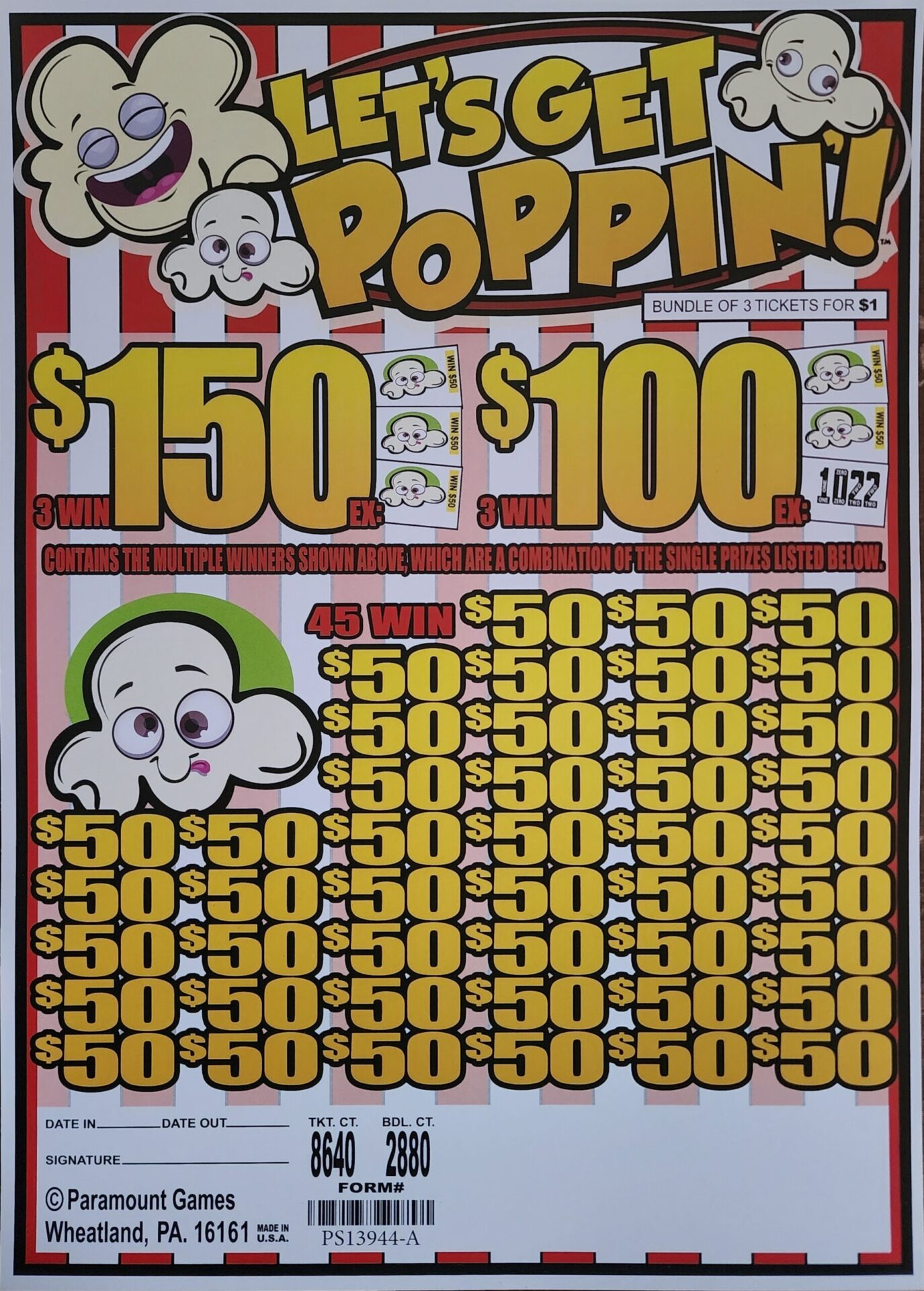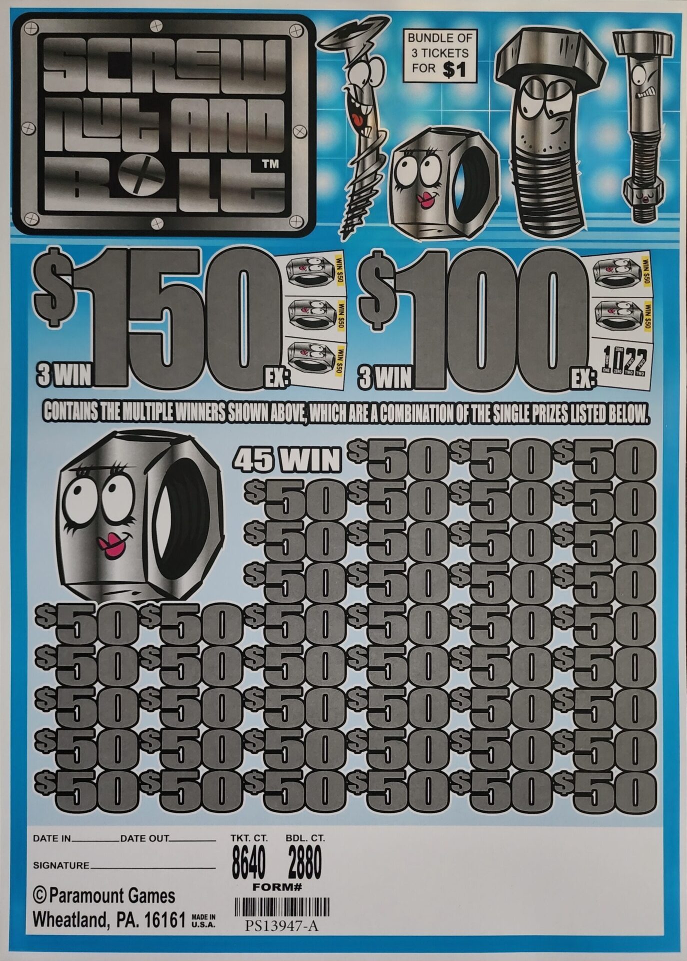 $1 per bundle – 2880 Bundles (8640 total tickets) – $150 Top Prize – $50 Bottom Prize.